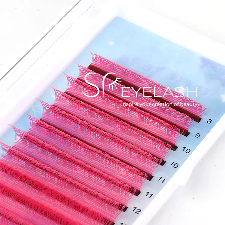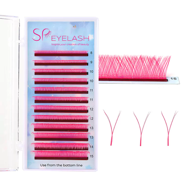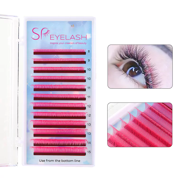 Różowe rzęsy YY są w różnych długościach, zwykle od 8 mm do 15 mm, aby zaspokoić różne style rzęs i preferencje. W przypadku rogów wewnętrznych i zewnętrznych spróbuj użyć krótszych rzęs, takich jak od 8 mm do 10 mm, a dla środkowej części wybierz 10-12 mm i najdłuższy jako 13 mm. Długości 14 i 15 mm można użyć, gdy klienci wolą naprawdę dramatyczne i długie rzęsy.