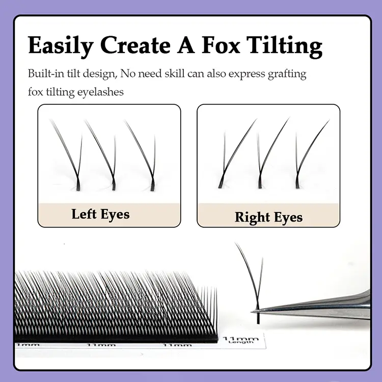 Rzęs rzęs Slant rzęs rzęs ma unikalną opadającą strukturę muchową, która naturalnie tworzy efekt w górę na ogonie oczu poprzez inteligentną 5-punktową konstrukcję z 3 długimi i 2 krótkimi (opcjonalnie 9-14 mm 9-14 mm). Technika tkactwa krzyżowego tworzy poczucie nakładania warstw, wypełniając luki między naturalnymi rzęsami i osiągając efekt nagich makijażu.